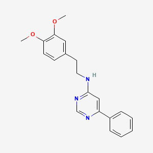 N-[2-(3,4-Dimethoxyphenyl)ethyl]-6-phenylpyrimidin-4-amine is a pyrimidine derivative characterized by a 6-phenylpyrimidine core substituted with an ethylamine side chain bearing 3,4-dimethoxyphenyl groups. Pyrimidines are biologically significant heterocyclic compounds, often utilized in pharmaceuticals due to their structural mimicry of nucleic acid bases .