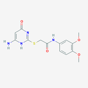 2-[(6-amino-4-oxo-1H-pyrimidin-2-yl)sulfanyl]-N-(3,4-dimethoxyphenyl)acetamide is a complex organic compound that has garnered attention in scientific research due to its potential applications in various fields such as chemistry, biology, medicine, and industry. This compound features a pyrimidinone core, an amino group, and a sulfanyl group, making it a versatile molecule for further chemical modifications and applications.