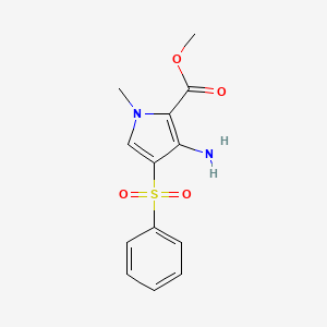 The mechanism of action of methyl 3-amino-1-methyl-4-(phenylsulfonyl)-1H-pyrrole-2-carboxylate would depend on its specific application. In a biological context, it could interact with molecular targets such as enzymes or receptors, modulating their activity through binding interactions. The pathways involved would be specific to the biological system being studied.