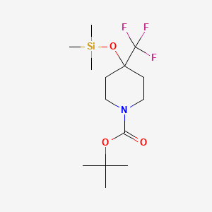 Tert-butyl 4-(trifluoromethyl)-4-(trimethylsilyloxy)piperidine-1-carboxylate is a piperidine derivative featuring a tert-butoxycarbonyl (Boc) protecting group at the 1-position and two distinct substituents at the 4-position: a trifluoromethyl (-CF₃) group and a trimethylsilyloxy (-OTMS) group. The Boc group enhances stability during synthetic processes, while the -CF₃ group introduces electron-withdrawing effects, and the -OTMS group provides lipophilicity and serves as a protective moiety for hydroxyl functionality. This compound is pivotal in medicinal chemistry for synthesizing intermediates with tailored reactivity and pharmacokinetic properties .