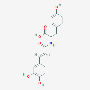 N-[3',4'-Dihydroxy-(E)-cinnamoyl]-L-tyrosine is a phenolic amide conjugate comprising a caffeic acid (3',4'-dihydroxycinnamic acid) moiety linked via an amide bond to L-tyrosine. It is naturally found in cocoa (Theobroma cacao) and coffee beans (Coffea spp.), where it contributes to sensory properties such as astringency . Its molecular formula is C₁₈H₁₇NO₆ (MW: 343.33 g/mol), with a structure characterized by: