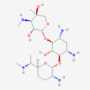 The IUPAC name for this compound is (2R,3R,4R,5R)-2-[(1S,2S,3R,4S,6R)-4,6-diamino-3-[(2R,3R,6S)-3-amino-6-[(1R)-1-(methylamino)ethyl]oxan-2-yl]oxy-2-hydroxycyclohexyl]oxy-5-methyl-4-(methylamino)oxane-3,5-diol.