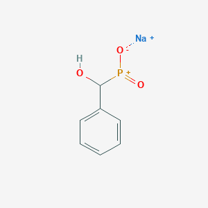 The mechanism of action of sodium hydroxybenzylphosphinate involves its interaction with molecular targets such as enzymes and receptors. The hydroxybenzyl group allows the compound to bind to specific sites on enzymes, inhibiting their activity. This inhibition can disrupt various biochemical pathways, leading to therapeutic effects in medical applications. The phosphorus atom plays a crucial role in the compound’s ability to form stable complexes with metal ions, which is important for its use in industrial applications .