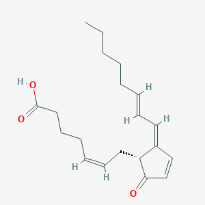 15-Deoxy-Δ12,14-Prostaglandin J2 (15d-PGJ2) is a naturally occurring prostaglandin, a class of lipid compounds derived from fatty acids in the body. tandfonline.com Specifically, it is a terminal product of the cyclooxygenase (COX) pathway and a metabolite of prostaglandin D2 (PGD2). dovepress.commedchemexpress.com 15d-PGJ2 belongs to the cyclopentenone prostaglandin (cyPG) family, which is characterized by a chemically reactive α,β-unsaturated carbonyl group within its cyclopentenone ring structure. dovepress.come-century.us This structural feature, particularly the electrophilic carbon atom, is crucial for many of its biological activities, as it can react with cellular nucleophiles like the thiol groups of cysteine residues in proteins. tandfonline.commdpi.com