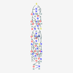 This compound is a macrocyclic peptide antibiotic characterized by a complex structure containing multiple thiazole rings, dehydroamino acids, and a central dehydropiperidine ring. Its chemical and physical properties are summarized in the table below.