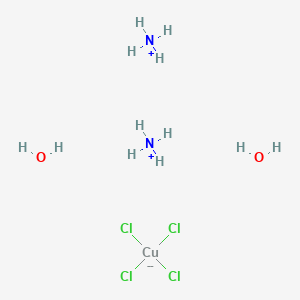 Ammonium tetrachlorocuprate(II) dihydrate, with the chemical formula (NH₄)₂[CuCl₄]·2H₂O, is a coordination compound characterized by its bright blue crystalline appearance and hygroscopic nature . Its molecular weight is 277.47 g/mol, and it crystallizes in a monoclinic system with a density of 1.993 g/cm³ . The compound decomposes at 110°C, losing its water of crystallization and transitioning into an anhydrous form . Structurally, it consists of a [CuCl₄]²⁻ tetrahedral anion balanced by two NH₄⁺ cations and stabilized by two water molecules .