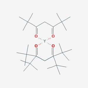 Y(TMHD)₃ consists of a central yttrium ion coordinated by three TMHD ligands. Each TMHD ligand (C₁₁H₂₀O₂) is a β-diketone with two ketone groups that chelate the metal ion via oxygen atoms, forming a stable six-membered ring . The bulky tert-butyl groups (C(CH₃)₃) on the ligand enhance steric protection, reducing unwanted side reactions and stabilizing the complex during vapor deposition processes . The octahedral coordination geometry of Y(TMHD)₃ is critical for its volatility and suitability in chemical vapor deposition (CVD) .
