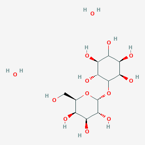 Galactinol dihydrate (C12H22O11·2H2O) is a hydrated form of galactinol, a key intermediate in the biosynthesis of raffinose family oligosaccharides (RFOs) in plants. Galactinol is synthesized via galactinol synthase (GolS), which transfers a galactosyl moiety from UDP-galactose to myo-inositol . This compound plays a critical role in plant stress responses, acting as an osmoprotectant and antioxidant. Its dihydrate form stabilizes the molecule in crystalline states, enhancing its solubility and bioavailability in cellular environments. Studies highlight its accumulation during seed maturation and under abiotic stress conditions (e.g., drought, heat), where it mitigates oxidative damage by scavenging reactive oxygen species (ROS) .