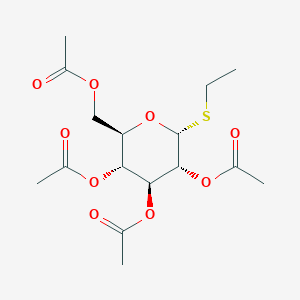 Ethyl 2,3,4,6-tetra-O-acetyl-α-D-thioglucopyranoside is a thioglycoside derivative of glucose where the hydroxyl groups at positions 2, 3, 4, and 6 are acetylated, and the anomeric oxygen is replaced with a thiol group (-SH) linked to an ethyl group. This compound is widely used in carbohydrate chemistry as a glycosyl donor or substrate analog for studying enzymatic mechanisms, particularly in glycosidase and glycosyltransferase assays . Its acetyl groups enhance solubility in organic solvents, making it suitable for glycosylation reactions, while the thioether linkage provides stability against hydrolysis compared to O-glycosides .