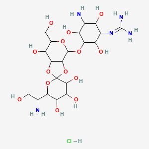 2-[3-amino-5-[6'-(1-amino-2-hydroxyethyl)-3',4',5',7-tetrahydroxy-6-(hydroxymethyl)spiro[4,6,7,7a-tetrahydro-3aH-[1,3]dioxolo[4,5-c]pyran-2,2'-oxane]-4-yl]oxy-2,4,6-trihydroxycyclohexyl]guanidine;hydrochloride |