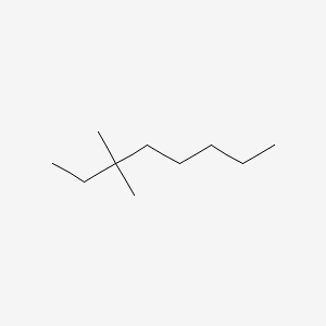 3,3-Dimethyloctane is a branched-chain alkane, an organic compound consisting of ten carbon atoms and twenty-two hydrogen atoms.[1] Its chemical formula is C₁₀H₂₂.[1][2] As a structural isomer of decane, its two methyl groups are attached to the third carbon atom of the octane (B31449) backbone.[1] This specific branching pattern influences its physical properties, differentiating it from its straight-chain counterpart and other isomers. This compound presents as a colorless liquid at room temperature.[1][3] Due to its nonpolar nature, it is nearly insoluble in water but soluble in organic solvents like ethanol (B145695) and ether.[1][3] This document provides a comprehensive overview of its key physical properties, the experimental methodologies used for their determination, and a workflow for its physical characterization.