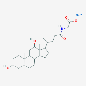 Sodium 2-[[(4R)-4-[(3R,5R,8R,9S,10S,12S,13R,14S,17R)-3,12-dihydroxy-10,13-dimethyl-2,3,4,5,6,7,8,9,11,12,14,15,16,17-tetradecahydro-1H-cyclopenta[a]phenanthren-17-yl]pentanoyl]amino]acetate (CAS: 302-95-4) is a sodium salt derivative of a bile acid-like steroid. Its molecular formula is C₂₄H₃₉O₄·Na, with a molecular weight of 414.554 g/mol . The compound features a cyclopenta[a]phenanthrene core substituted with hydroxyl groups at positions 3 and 12, methyl groups at positions 10 and 13, and a sodium-carboxylated side chain. The sodium counterion enhances aqueous solubility, making it suitable for pharmacological applications requiring systemic delivery .