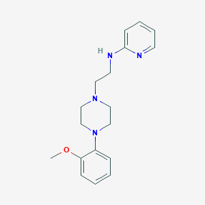 N-[2-[4-(2-Methoxyphenyl)piperazin-1-yl]ethyl]pyridin-2-amine (IUPAC name) is a piperazine derivative critical in synthesizing radiolabeled serotonin 5-HT1A receptor imaging agents such as <sup>131</sup>I-MPPI and <sup>18</sup>F-MPPF . Its molecular formula is C18H24N4O·H2O (monohydrate), with a molecular weight of 330.43 g/mol . The compound crystallizes in an orthorhombic system (space group Pna21) with a chair-conformation piperazine ring. Key structural features include: