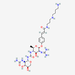 C[C@@H]1[C@H]([C@@H]([C@H]([C@H](O1)OC2=CC=C(C=C2)/C=C/C(=O)NCCCNCCCCN)N=C(N)N)O)NC(=O)N[C@H]3[C@@H]([C@H]([C@@H](CO3)O)O)NC(=O)N |