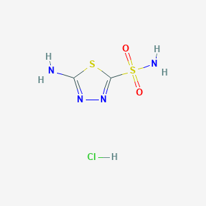5-Amino-1,3,4-thiadiazole-2-sulfonamide hydrochloride salt (CAS: 14949-00-9; molecular formula: C₂H₅ClN₄O₂S₂) is a sulfonamide derivative with a heterocyclic 1,3,4-thiadiazole core . It is synthesized via desacetylation of acetazolamide (a well-known carbonic anhydrase inhibitor) using concentrated hydrochloric acid, followed by neutralization with sodium bicarbonate . The compound exhibits significant inhibitory activity against human carbonic anhydrase (hCA) isoforms, particularly hCA II, making it a candidate for glaucoma therapy and antitumor applications . Its hydrochloride salt form enhances solubility and stability, critical for pharmaceutical formulations .
