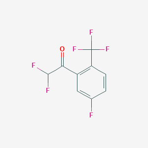 2,2-Difluoro-1-(5-fluoro-2-(trifluoromethyl)phenyl)ethanone is a fluorinated aromatic ketone characterized by a difluoroacetophenone backbone substituted with a 5-fluoro-2-(trifluoromethyl)phenyl group. This compound is of interest in synthetic organic chemistry due to its electron-deficient aromatic system, which enhances reactivity in nucleophilic substitutions and metal-catalyzed coupling reactions. The trifluoromethyl (-CF₃) and fluorine substituents contribute to its high thermal stability and lipophilicity, properties critical for applications in agrochemicals and pharmaceuticals .