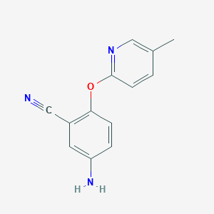 The mechanism of action of 5-Amino-2-((5-methylpyridin-2-yl)oxy)benzonitrile involves its interaction with specific molecular targets. The amino and nitrile groups can form hydrogen bonds and other interactions with biological macromolecules, influencing their function. The exact pathways and targets depend on the specific application and are subjects of ongoing research.