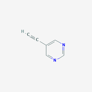 This compound is structurally composed of a diazine ring (pyrimidine) with an acetylene substituent at the C5 position. This arrangement confers specific reactivity, particularly at the terminal alkyne.
