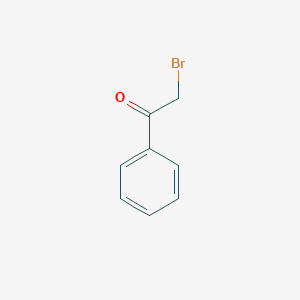 2-Bromoacetophenone, also known as phenacyl bromide, is a halogenated aromatic ketone with the chemical formula C₈H₇BrO. It serves as a versatile reagent and building block in organic synthesis, particularly in the pharmaceutical industry. Its reactivity, stemming from the presence of both a carbonyl group and a reactive bromine atom on the α-carbon, makes it a valuable precursor for the synthesis of a wide array of heterocyclic compounds and other complex organic molecules. This technical guide provides an in-depth overview of the physical, chemical, and biological properties of this compound, with a focus on its role as an enzyme inactivator.