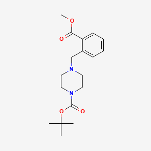 The synthesis of tert-Butyl 4-[2-(methoxycarbonyl)-benzyl]piperazine-1-carboxylate typically involves the reaction of piperazine with tert-butyl chloroformate and 2-(methoxycarbonyl)benzyl chloride. The reaction is carried out under basic conditions, often using a base such as triethylamine or sodium carbonate to neutralize the hydrochloric acid formed during the reaction. The reaction mixture is usually stirred at room temperature or slightly elevated temperatures to ensure complete conversion.