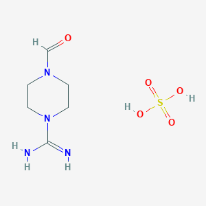 4-Formylpiperazine-1-carboximidamide sulfate is a piperazine-derived compound characterized by a formyl group (-CHO) at the 4-position of the piperazine ring, a carboximidamide functional group (-C(=NH)NH₂), and a sulfate counterion. This structure confers unique physicochemical properties, making it valuable in medicinal chemistry as an intermediate for synthesizing bioactive molecules. The sulfate moiety enhances aqueous solubility, which is critical for pharmaceutical applications .