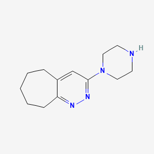 3-(Piperazin-1-yl)-6,7,8,9-tetrahydro-5H-cyclohepta[c]pyridazine is a bicyclic heterocyclic compound featuring a pyridazine ring fused to a seven-membered cycloheptane ring, with a piperazine substituent at the 3-position. This structure combines the conformational flexibility of the piperazine moiety with the rigidity of the cycloheptapyridazine core, making it a candidate for diverse pharmacological applications. Piperazine derivatives are frequently explored for their bioactivity, particularly in central nervous system (CNS) and enzyme-targeting therapies .