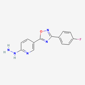 The mechanism of action of 5-[3-(4-Fluorophenyl)-1,2,4-oxadiazol-5-yl]-2-hydrazinylpyridine involves its interaction with specific molecular targets. The oxadiazole ring can interact with enzymes and receptors, modulating their activity. The fluorophenyl group enhances binding affinity and specificity, while the hydrazinyl group can form hydrogen bonds, further stabilizing the compound-target complex.
