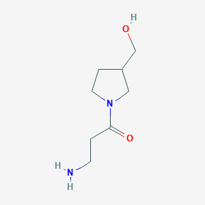 3-Amino-1-[3-(hydroxymethyl)pyrrolidin-1-yl]propan-1-one plays a significant role in biochemical reactions. It interacts with various enzymes, proteins, and other biomolecules. For instance, it has been observed to interact with pyrrolidine derivatives, which are known for their biological activity. The nature of these interactions often involves binding to active sites of enzymes, leading to either inhibition or activation of enzymatic activity. This compound’s ability to form stable complexes with proteins makes it a valuable tool in studying enzyme kinetics and protein-ligand interactions.