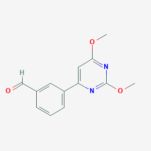 3-(2,6-Dimethoxypyrimidin-4-YL)benzaldehyde is a heterocyclic organic compound characterized by a pyrimidine core substituted with methoxy groups at positions 2 and 6, and a benzaldehyde moiety attached at position 4. Its molecular formula is C₁₃H₁₂N₂O₃ , with a molecular weight of 244.25 g/mol . The structure comprises: