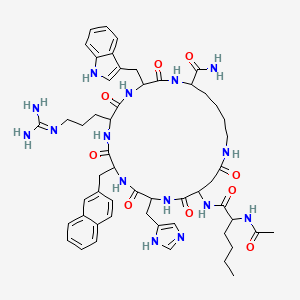 - IUPAC Name : (3S,6S,9R,12S,15S,23S)-15-(2-acetamidohexanoylamino)-6-[3-(diaminomethylideneamino)propyl]-12-(1H-imidazol-5-ylmethyl)-3-(1H-indol-3-ylmethyl)-9-(naphthalen-2-ylmethyl)-2,5,8,11,14,17-hexaoxo-1,4,7,10,13,18-hexazacyclotricosane-23-carboxamide