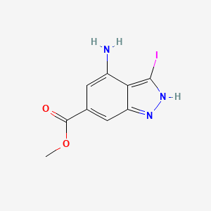 Methyl 4-amino-3-iodo-1H-indazole-6-carboxylate is a synthetic organic compound belonging to the indazole family. Indazoles are heterocyclic compounds containing a fused benzene and pyrazole ring system. This particular compound is characterized by the presence of an amino group at the 4-position, an iodine atom at the 3-position, and a methyl ester group at the 6-position of the indazole ring. Indazole derivatives are known for their diverse biological activities and are widely studied for their potential therapeutic applications.