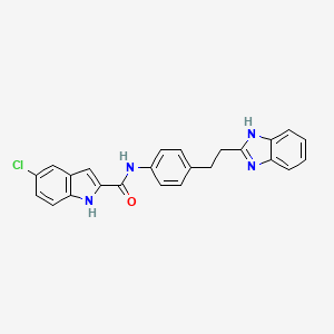 The synthesis of N-[4-[2-(1H-benzimidazol-2-yl)ethyl]phenyl]-5-chloro-1H-indole-2-carboxamide typically involves multiple steps, including the formation of the benzimidazole and indole rings, followed by their coupling. One common method involves the cyclization of o-phenylenediamine with carboxylic acids or their derivatives to form the benzimidazole ring . The indole ring can be synthesized through Fischer indole synthesis, which involves the reaction of phenylhydrazine with ketones or aldehydes .