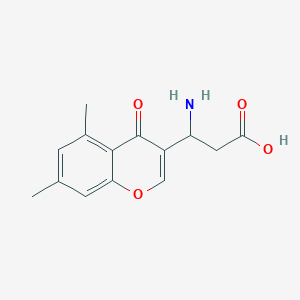 3-amino-3-(5,7-dimethyl-4-oxochromen-3-yl)propanoic acid: is a synthetic organic compound that belongs to the class of benzopyran derivatives. Benzopyrans, also known as chromenes, are a group of compounds characterized by a benzene ring fused to a pyran ring. This particular compound features an amino group and a propanoic acid moiety, making it a versatile molecule for various chemical reactions and applications.