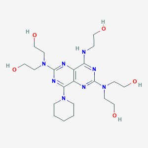 The primary synthetic route involves reacting 2,6-dichloro-4,8-bis(piperidin-1-yl)pyrimido[5,4-d]pyrimidine with diethanolamine under controlled conditions. This two-stage process replaces chlorine atoms at the 2- and 6-positions of the pyrimidopyrimidine core with diethanolamine groups.