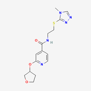 N-(2-((4-Methyl-4H-1,2,4-triazol-3-yl)thio)ethyl)-2-((tetrahydrofuran-3-yl)oxy)isonicotinamide is a heterocyclic compound featuring a 1,2,4-triazole core substituted with a methyl group at position 4, a thioether-linked ethyl chain, and an isonicotinamide moiety modified with a tetrahydrofuran-3-yloxy group. The 1,2,4-triazole ring is known for its stability and versatility in drug design, often contributing to hydrogen bonding and π-π stacking interactions with biological targets . The tetrahydrofuran (THF) substituent enhances solubility and influences conformational flexibility, while the isonicotinamide group may confer affinity for enzymes or receptors, such as those involved in microbial or neurological pathways .