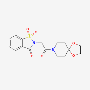 The compound 2-(2-oxo-2-(1,4-dioxa-8-azaspiro[4.5]decan-8-yl)ethyl)benzo[d]isothiazol-3(2H)-one 1,1-dioxide is a complex organic molecule that has garnered interest in the field of medicinal chemistry due to its potential biological activities. This article provides a comprehensive overview of its biological activity, including mechanisms of action, therapeutic applications, and relevant research findings.