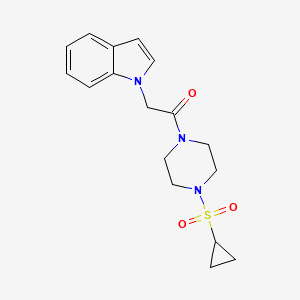 The mechanism of action of 1-(4-(cyclopropylsulfonyl)piperazin-1-yl)-2-(1H-indol-1-yl)ethanone involves its interaction with specific molecular targets. The indole moiety can interact with various receptors in the central nervous system, potentially modulating neurotransmitter activity. The piperazine ring can also interact with other biological targets, contributing to the compound’s overall effects.