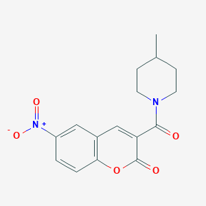 3-(4-Methylpiperidine-1-carbonyl)-6-nitro-2H-chromen-2-one is a synthetic coumarin derivative characterized by a 4-methylpiperidine-1-carbonyl group at the 3-position and a nitro substituent at the 6-position of the chromen-2-one scaffold. Coumarins are renowned for their diverse pharmacological activities, including anticoagulant, antimicrobial, and anticancer properties .