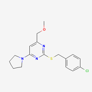 The compound [2-[(4-Chlorobenzyl)sulfanyl]-6-(1-pyrrolidinyl)-4-pyrimidinyl]methyl methyl ether, also known as a pyrimidine derivative, has garnered attention in various biological studies due to its potential therapeutic applications. This article reviews the biological activity of this compound, focusing on its mechanisms of action, pharmacological effects, and relevant case studies.