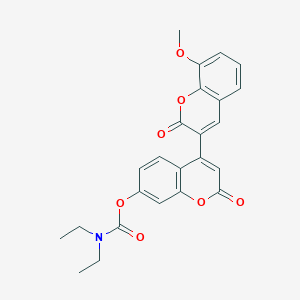 The synthesis of 8-methoxy-2,2’-dioxo-2H,2’H-[3,4’-bichromen]-7’-yl diethylcarbamate typically involves multiple steps, including the formation of the bichromen core and subsequent functionalization. One common synthetic route starts with the preparation of the chromen units, which are then coupled to form the bichromen structure. The methoxy group is introduced through methylation reactions, while the diethylcarbamate group is added via carbamation reactions using diethylamine and appropriate carbamoylating agents .