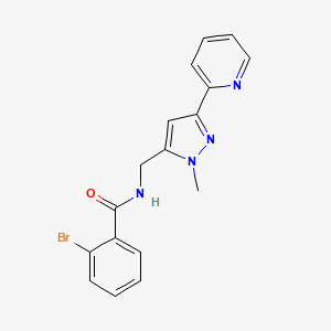 2-Bromo-N-[(2-methyl-5-pyridin-2-ylpyrazol-3-yl)methyl]benzamide is a complex organic compound that features a brominated benzamide structure linked to a pyrazole and pyridine moiety