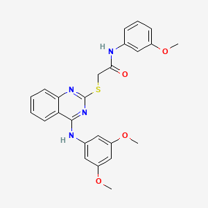 The compound’s quinazoline core provides a planar aromatic system for π-π stacking with biomolecular targets, while the sulfanyl linkage enhances reactivity for covalent or non-covalent interactions. The 3,5-dimethoxyphenyl and 3-methoxyphenyl groups contribute to solubility and target affinity via hydrophobic and hydrogen-bonding interactions .
