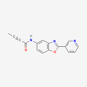 N-(2-(pyridin-3-yl)benzo[d]oxazol-5-yl)but-2-ynamide is a synthetic small molecule characterized by a benzoxazole core substituted with a pyridin-3-yl group at position 2 and a but-2-ynamide moiety at position 3. The benzoxazole scaffold is a privileged structure in medicinal chemistry due to its aromatic heterocyclic nature, which facilitates π-π stacking interactions and hydrogen bonding with biological targets . This compound is of interest in drug discovery, particularly for targeting enzymes or receptors where such structural motifs are known to exhibit inhibitory or modulatory effects.