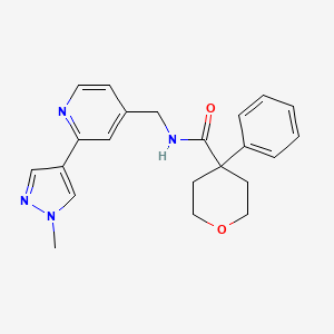 N-((2-(1-methyl-1H-pyrazol-4-yl)pyridin-4-yl)methyl)-4-phenyltetrahydro-2H-pyran-4-carboxamide is a structurally complex carboxamide derivative featuring a tetrahydro-2H-pyran core substituted with a phenyl group and a pyridinyl-methyl moiety bearing a 1-methylpyrazole substituent. This compound’s design integrates heterocyclic motifs (pyridine, pyrazole) and a rigid tetrahydropyran scaffold, which are common in medicinal chemistry for optimizing pharmacokinetic properties and target binding .