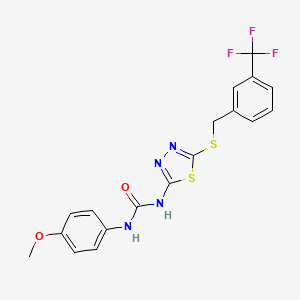 1-(4-Methoxyphenyl)-3-(5-((3-(trifluoromethyl)benzyl)thio)-1,3,4-thiadiazol-2-yl)urea is a synthetic urea derivative featuring a 1,3,4-thiadiazole core functionalized with a 3-(trifluoromethyl)benzylthio substituent at the 5-position and a 4-methoxyphenylurea group at the 2-position. The compound’s structure combines a thiadiazole ring, known for its metabolic stability and hydrogen-bonding capacity, with a trifluoromethyl group that enhances lipophilicity and bioavailability . Urea moieties are critical for intermolecular interactions, such as hydrogen bonding, which may contribute to biological activity, particularly in enzyme inhibition or receptor binding.