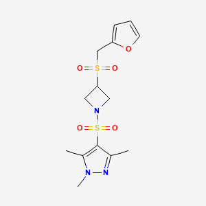 The compound 4-((3-((furan-2-ylmethyl)sulfonyl)azetidin-1-yl)sulfonyl)-1,3,5-trimethyl-1H-pyrazole is a complex organic molecule characterized by its unique structural features, including a pyrazole ring, azetidine moiety, and sulfonyl groups. This compound has garnered attention in medicinal chemistry due to its potential biological activities, particularly in antimicrobial and anticancer applications.