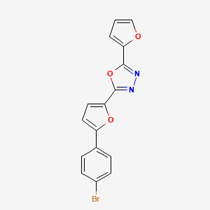 The mechanism of action of 2-[5-(4-Bromophenyl)furan-2-yl]-5-(furan-2-yl)-1,3,4-oxadiazole involves its interaction with specific molecular targets, such as enzymes or receptors. The bromophenyl group can enhance binding affinity through halogen bonding, while the furan and oxadiazole rings can participate in π-π stacking interactions and hydrogen bonding. These interactions can modulate the activity of the target proteins, leading to the observed biological effects.