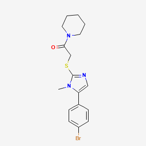 2-((5-(4-bromophenyl)-1-methyl-1H-imidazol-2-yl)thio)-1-(piperidin-1-yl)ethanone, often referred to as a complex organic compound, has garnered attention in medicinal chemistry due to its potential biological activities. Its unique structural features, including the presence of an imidazole ring, a bromophenyl group, and a thioether linkage, suggest a variety of interactions with biological targets.