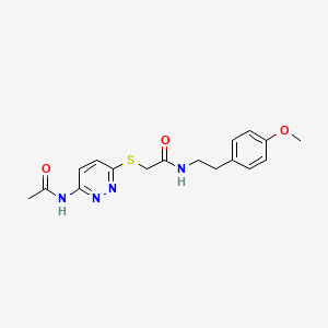 2-((6-acetamidopyridazin-3-yl)thio)-N-(4-methoxyphenethyl)acetamide is a synthetic compound belonging to the class of pyridazine derivatives. Its unique structure includes a pyridazine ring, an acetamido group, and a thioether linkage, which contribute to its potential biological activities. This article explores the biological activity of this compound, focusing on its pharmacological properties, mechanisms of action, and relevant case studies.