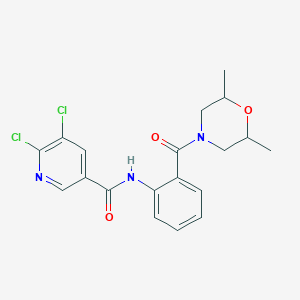 5,6-dichloro-N-[2-(2,6-dimethylmorpholine-4-carbonyl)phenyl]pyridine-3-carboxamide: is a complex organic compound characterized by its multiple functional groups, including chloro, morpholine, and carboxamide groups